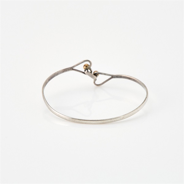 交差する可愛らしいハートモチーフが印象的なフック&アイのバングルです。細身のリングとハートモチーフの絶妙なバランスは、スタイリッシュさとエレガンスの両方を演出します。
