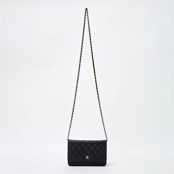 上品なチェーンストラップが特徴で、CHANELのアイコニックなデザインが魅力的な一品です。ブラックのキャビアスキン素材が都会的な印象を与えます。